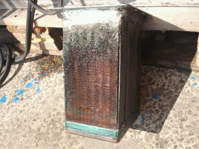 インタークーラーのコアで塩が結晶化していました。腐食したケースとの隙間から海水が漏れ固まったようです。エンジンは見えないところで何が起きているか判りません。